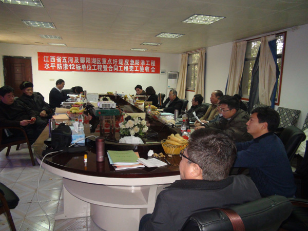 2012年1月10日,江西省五河及鄱陽湖區(qū)重點圩堤應(yīng)急防滲工程建設(shè)項目部在江西省共青城市主持召開了水平防滲12標(biāo)單位工程暨合同工程完工驗收會,并順利通過了單位工程暨合同工程完工驗收。驗收會由省河湖局許盛豐主持。公司吳鐵凡總工程師、工程部郭洪有經(jīng)理參加了驗收會。