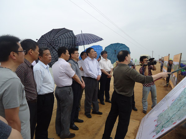 當(dāng)天一大早,董力一行乘船從星子縣出發(fā)趕赴余干縣。在康山大堤鑼鼓山碼頭上岸后,先后來到我司承建完工的鑼鼓山排澇泵站改造工程和康山3標(biāo)工地康山蓄滯洪區(qū)分洪門施工段(KS20+500),并在分洪門施工段(KS20+500)聽取了余干縣水利部門的有關(guān)情況匯報。在看到康山大堤除險加固工程已進(jìn)入掃尾階段,大堤堤面寬闊,董力表示滿意。