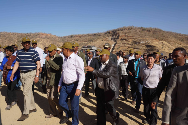 下午3時(shí)許,總統(tǒng)、總理和議長(zhǎng)抵達(dá)工地后,就頂著40度的高溫馬不停蹄趕往主壩和灌溉隧洞引水渠,詳細(xì)視察現(xiàn)場(chǎng)情況。承包商Sur公司負(fù)責(zé)人Tadesse Yemane向三位領(lǐng)導(dǎo)報(bào)告了工程概況和現(xiàn)場(chǎng)進(jìn)度,并介紹了整個(gè)大壩防滲的關(guān)鍵部分——基礎(chǔ)灌漿和瀝青混凝土芯墻——是由江西水建承建的。公司項(xiàng)目經(jīng)理黃生寶向三位領(lǐng)導(dǎo)簡(jiǎn)要匯報(bào)了灌漿項(xiàng)目的完成情況,并表達(dá)了又好又快完成瀝青混凝土芯墻和灌溉隧洞的堅(jiān)定決心和信心。領(lǐng)導(dǎo)們對(duì)我公司的成績(jī)表示肯定,希望我們?cè)俳釉賲?、?yōu)質(zhì)高效地完成接下來(lái)的工作,為早日實(shí)現(xiàn)蓄水和灌溉做出努力。