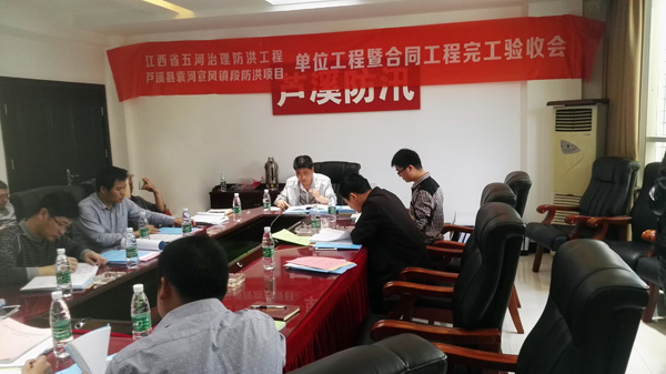 2017年4月19日蘆溪縣五河治理防洪工程項目部在蘆溪縣主持召開了江西省五河治理防洪工程蘆溪縣袁河宣風鎮(zhèn)段防洪項目單位工程暨合同工程完工驗收會議。蘆溪縣五河治理防洪工程項目部、江西省水利規(guī)劃設(shè)計研究院、江西省建洪工程監(jiān)理咨詢有限公司、江西省水利水電建設(shè)有限公司、蘆溪縣宣風鎮(zhèn)鎮(zhèn)人民政府和銀河鎮(zhèn)人民政府等單位代表參加了本次驗收會議,并成立了單位工程暨合同工程完工驗收工作組,萍鄉(xiāng)市水工程建設(shè)監(jiān)督管理站列席了本次會議。