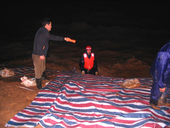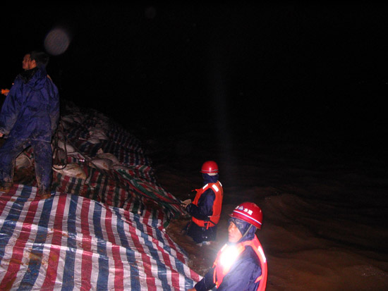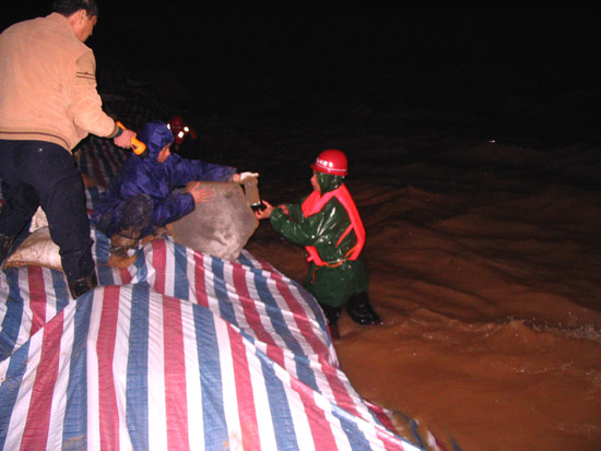 根據(jù)以往的施工經(jīng)驗,我們很快啟動了搶險應(yīng)急預(yù)案。但由于環(huán)境惡劣,考驗我們的時候到了,要發(fā)揚我們江西水建人“特別能吃苦、特別能戰(zhàn)斗、特別能忍耐、特別能協(xié)作精神”的時候到了,我們與洪水搶時間、爭進度,全體干群在漆黑的大堤上是一片穿梭奔跑的身影,大家齊心協(xié)力,手提肩扛,把一百多斤一塊的混凝土預(yù)制塊,一塊塊運到堤腳,此時項目部總工曾俊平不顧江水的寒冷,帶領(lǐng)其它幾名員工,奮身躍入水中,在水下鋪設(shè)彩條布,而此時水下溫度只有10℃左右,渾濁江水一浪高過一浪拍打在他們的身上。大家顧不上寒冷,顧不上疲勞,顧不上饑餓,衣服濕了又干,干了又濕,分不清是哪次被汗水還是雨水弄濕的,在微弱的手電光照亮下鋪設(shè)了一條又一條彩布條,碼起了一道又一道沙包小堤。經(jīng)過大家的緊張奮戰(zhàn),終于幾處險情得到了控制,等到我們在忙碌中回過神來時,已經(jīng)是次日的凌晨三點多鐘,盡管大家拖著一副疲憊不堪的泥身子,但大家臉上裝滿了滿意和勝利的微笑,王總此時飽含真情地對大家說了一聲:“大家真的辛苦了,謝謝大家!”走在回家的路上,我正好與項目總工曾俊平走在一起,我看到他渾身濕漉漉的,我關(guān)心的問他在水中冷嗎?他笑笑說道:“這是關(guān)鍵時刻,再冷也要下”。他旁邊的同事告訴我,他是從下午三點鐘就一直在水里做事直到剛才,整整在水中浸泡了十二個小時。我們參加搶險的同志被曾俊平這種不怕困難、不畏艱險、不顧個人安危、敢于吃苦的精神深深感動著,真是我們學(xué)習(xí)的好榜樣!