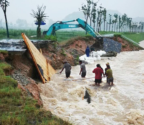 暴雨肆虐,洪災(zāi)無(wú)情。7月8日,雨勢(shì)加大,險(xiǎn)情加重,出現(xiàn)漫堤、農(nóng)田被淹等險(xiǎn)情,國(guó)家財(cái)產(chǎn)和人民群眾的生命安全正面臨嚴(yán)重威脅,危難當(dāng)前彰顯擔(dān)當(dāng),公司副總經(jīng)理曾朝文、總經(jīng)理助理杜凌冒雨在抗洪前線親自指揮,不顧個(gè)人安危,哪里有險(xiǎn)情就奮戰(zhàn)到哪里,經(jīng)過(guò)公司救援隊(duì)伍連續(xù)10余小時(shí)的奮勇?lián)寫?zhàn),險(xiǎn)情得到基本控制,確保了農(nóng)田和橋梁安全。